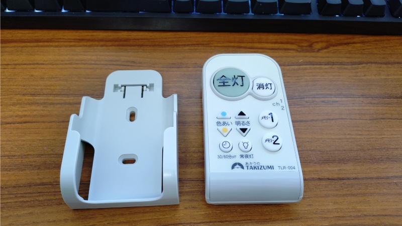 写真だとリモコンのサイズ感が伝わらないかと思うのですが、この全灯ボタンは500円玉サイズになっており、高齢の母親にも分かり易いという点が決め手です。また、付属のリモコンホルダーは裏側にスタンドアームが付いており、卓上スタンドとしても利用出来るようになっています。