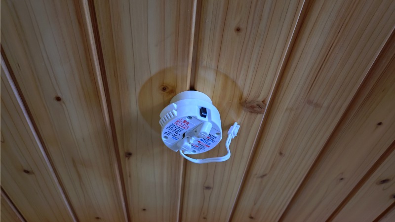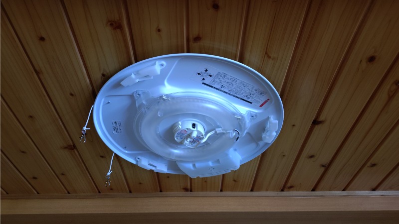この写真の本体左側に付いている紐のようなものはカバーの落下防止用紐になります。ネット上にも取り付けにくいとうコメントが複数あり、実際にやってみると脚立の上で天井を見上げながらの作業は確かに面倒で、脚立からの落下防止が必要になるくらいでした。