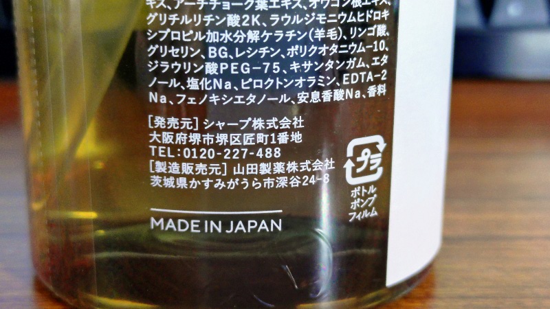 注文をしたのは7月8日になります。その時点では14日から29日の間にお届けとなっており、発送されないままの状態がしばらく続きましたが、7月23日にようやく発送となり、昨日の昼頃に自宅に届きました。こちらの写真のように発売元はシャープ株式会社となっていますが、製造販売元は茨城県にある山田製薬株式会社で、1910年に創業の化粧品や医薬部外品のOEM/ODMメーカーになるようです。