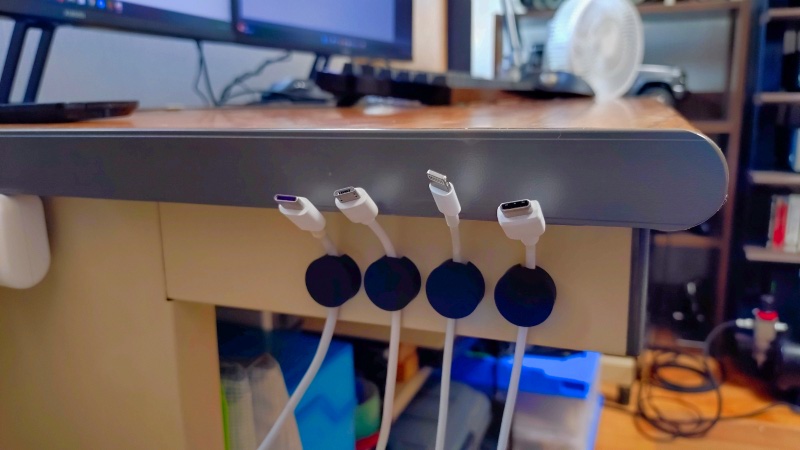 以前のようにデスクの天板側面に貼り付けていた時に比べるとケーブルが少々引き出し辛くなったようにも感じますが、上から見た時は天板側からホルダー部分が見えないためスッキリとした感じになりましたし、ケーブル同士の間隔も自由に調節出来て使い勝手は悪くないと思います。