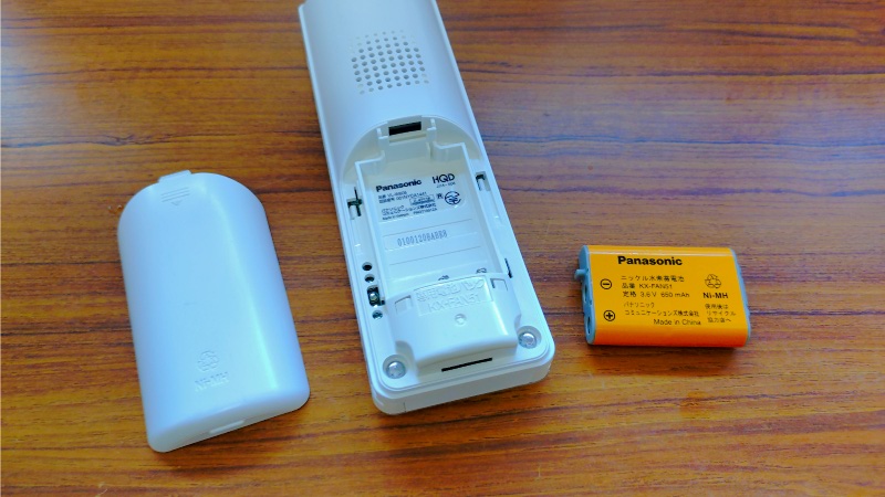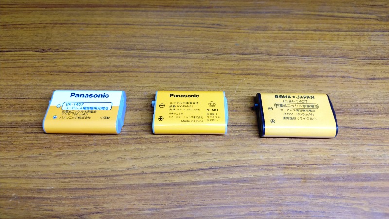 ということで、取り急ぎAmazonで交換用のバッテリーを購入しました。この写真の中央がダメになった古いバッテリーで、型番はKX-FAN51になります。その左側にあるのは追加した子機の方に付属していたバッテリーで、型番がBK-T407というKX-FAN51の後継品です。