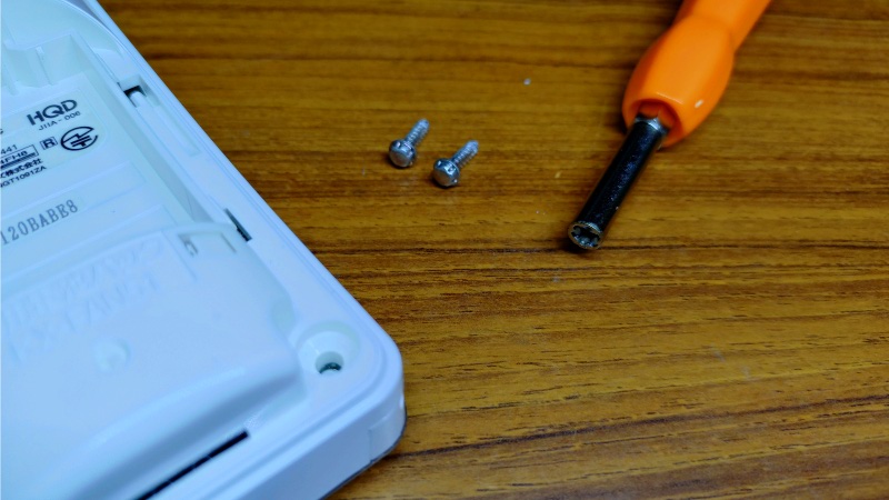 こういう機器は構造が良く分からないため分解するのも面倒な作業なのですが、どうやらこの写真の赤い丸印のところにあるネジ以外は見当たりませんので、とりあえずこの2本を外します。