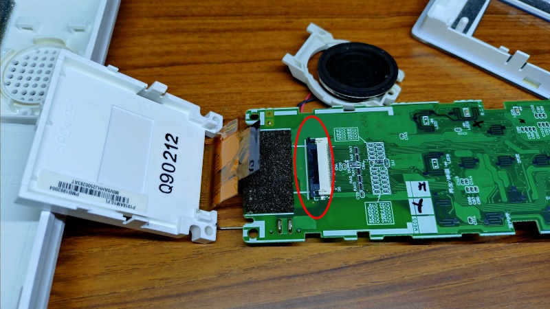 一応、液晶パネルに繋がるフラットケーブルは基板上にあるコネクタ部分で外すことが出来ましたので、引き抜いて接続部分の清掃などを行ったものの、残念ながら画面表示が復活することはありませんでした。尚、外す時は赤い丸印のところにあるロック用の黒いパーツをこの写真の左方向にスライドさせてからフラットケーブルを引き抜きます。