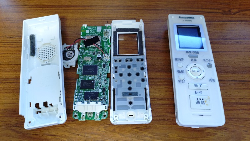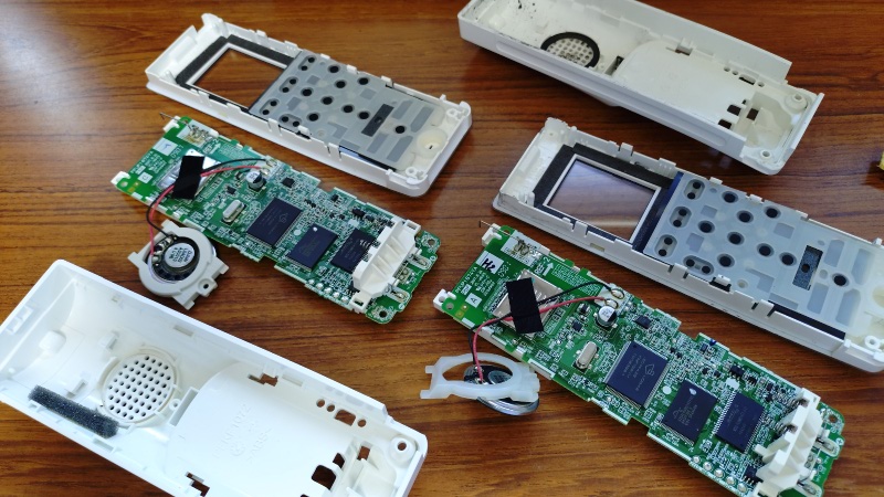 尚、この写真の左側が基盤が故障している子機になりますが、例えば液晶パネルやスピーカーなどのパーツは問題なく使用出来ますので、とりあえず組み立てて予備品として保管の予定です。