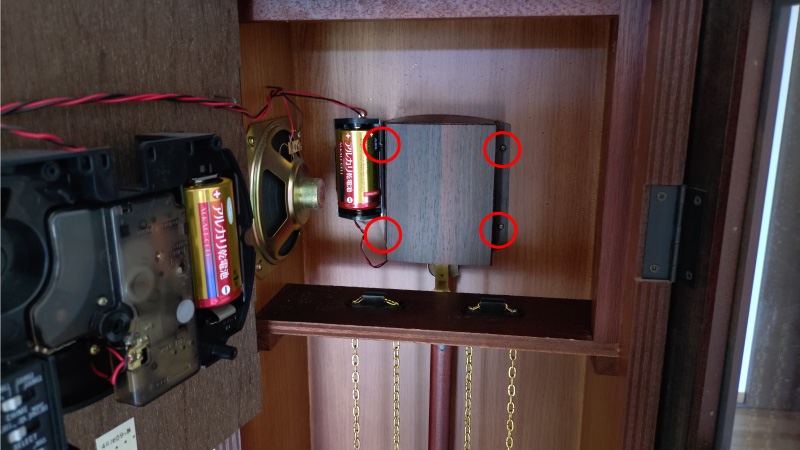 文字盤の部分を開くと内部に振り子の駆動装置が取り付けられています。木目のカバーで覆われていますので、この写真の赤い丸印のところにある小さなネジを外してやります。