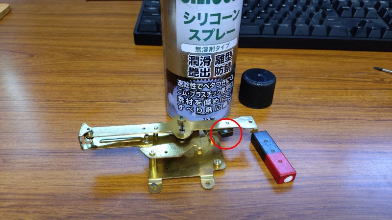磁力が強まったことが確認出来たら、次に振り子を動かすための機械部分、特に軸受けなどの可動部分に潤滑剤としてシリコーンスプレーを吹き掛けてやります。よくある556などの潤滑スプレーを誤って使用すると埃などが付着して動きが悪くなってしまうため注意が必要です。
