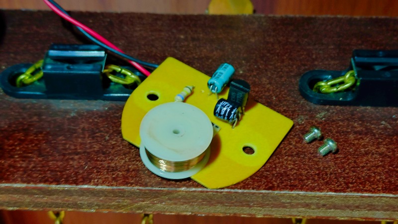 ここまでの作業が終了したところで駆動装置の仮組みを行い、振り子も取り付けて動きを確認してみたところ、残念ながら以前のような状態には戻らず、手で動かしてやってもしばらくすると動作が止まってしまいます。振り子を外すと駆動装置は左右に動いているため電子回路自体は作動しているようなのですが、この長くて重い振り子を動かしてやるだけのパワーが無い感じです。