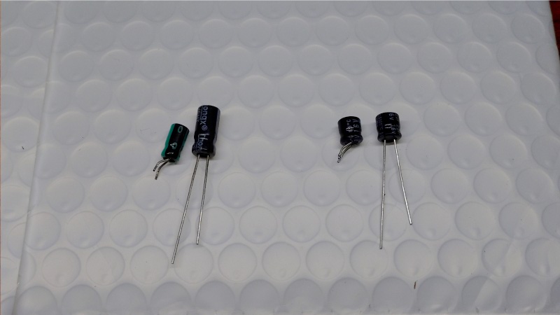 こちらの写真の左側が0.22μF、右側が22μFの電解コンデンサで、それぞれ基盤から外したものと新品を並べてみたものです。22μFの方は同じサイズですが、0.22μFの方は少々大きめでした。