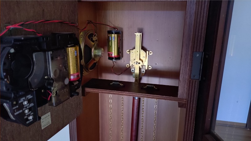 続いて振り子を取り付けて引き続き状態を確認します。動作を開始してから30分程度は動き続けていましたので、修理完了と判断して外してあったカバーも取り付けて元の状態に戻しました。