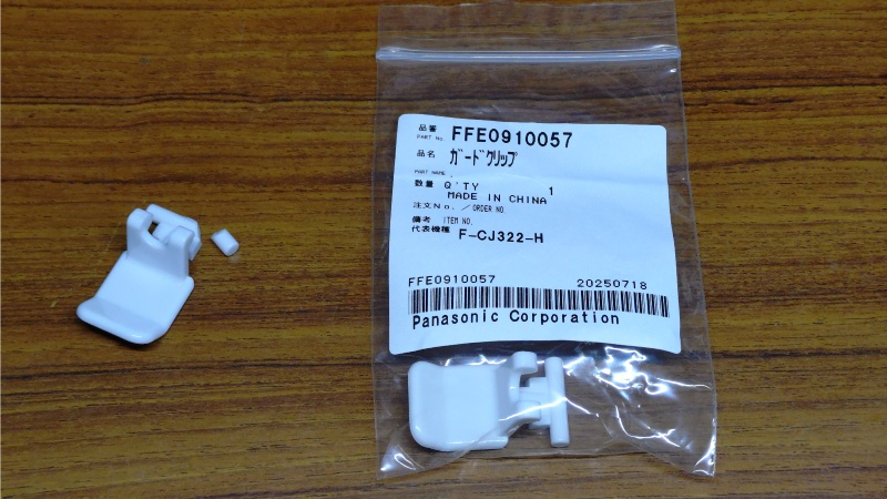 こちらの写真が破損していたクリップになります。前面ガードを固定するためのものですが、片側の軸の部分が完全に折損しています。折れて残った軸はピンセントで取り出しました。