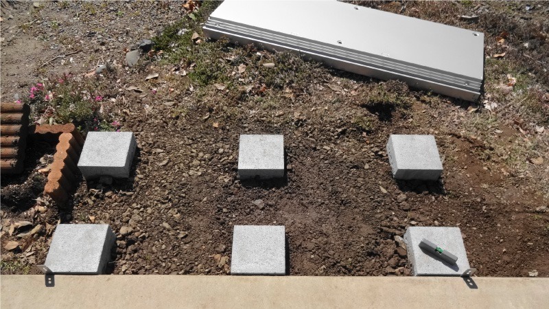 転倒防止用のアンカーを固定するためのコンクリートが固まりましたので、物置の基礎部分になるコンクリートブロックを配置します。