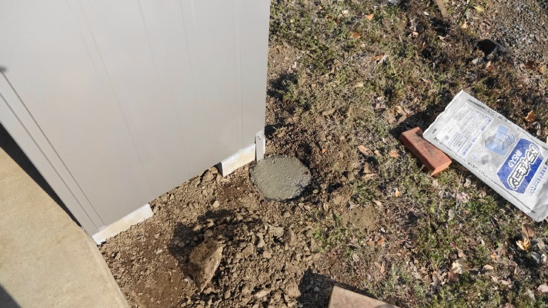 穴が掘れたら転倒防止用のアンカーを物置の側面に固定し、コンクリートを流し込んで作業は終了となります。