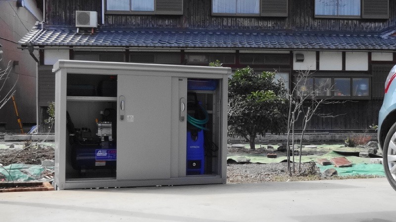こちらの写真が完成した状態になります。高圧洗浄機やコンプレッサー、フロアジャッキも無事に収納することが出来ました。