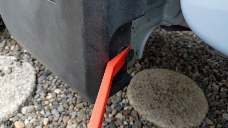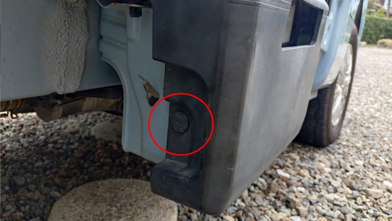 この軽トラのバッテリーは運転席側の前輪と後輪の中間あたりに取り付けられています。樹脂製の黒いカバーが左右にあるクリップで固定されていますので、最初にこのクリップを外します。