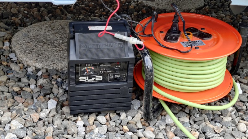 使用しているバッテリー充電器は大自工業(Meltec)のSL-3という型番の製品になります。箱の中に残っていた保証書を見ると購入日は平成11年3月28日と書かれていましたので、もう26年も前のかなり古い製品になります。今回も元気に稼働していましたのでまだまだ大丈夫そうです。